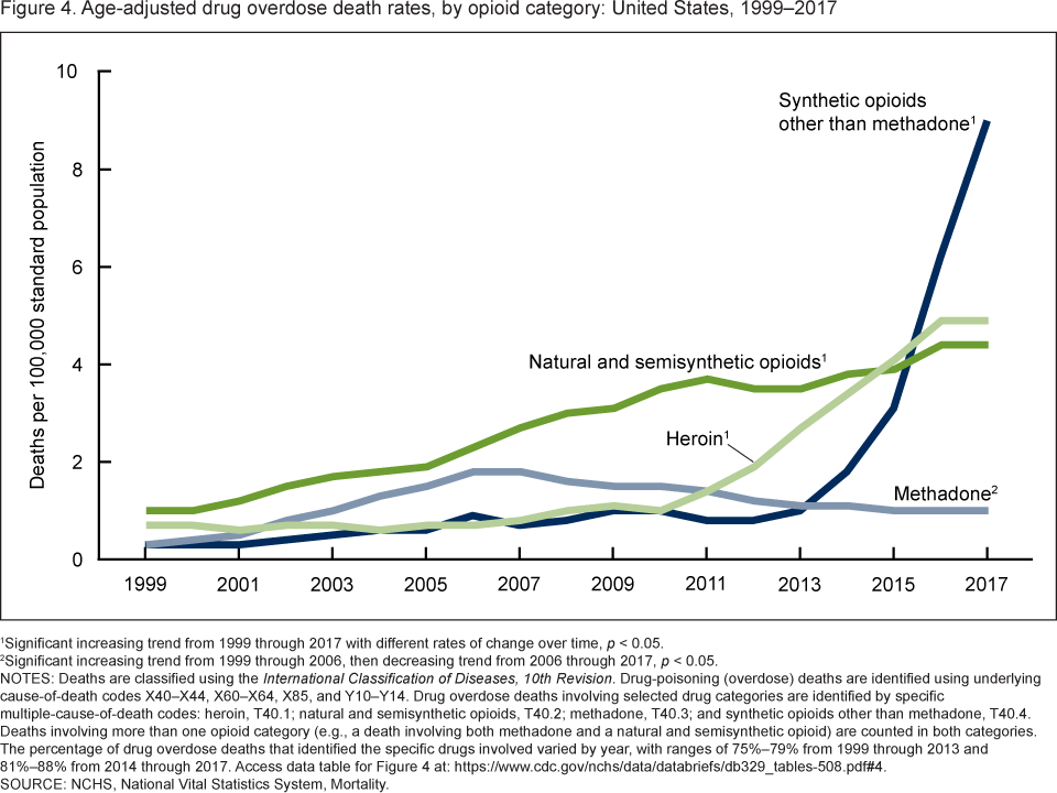 - The age-adjusted rate of drug overdose deaths involving synthetic opioids other than methadone increased by 45% from 2016 to 2017.