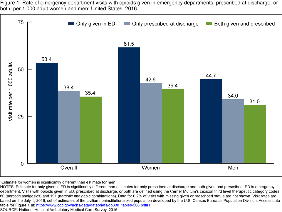 Figure 1. Rate of emergency department visits with opioids given in emergency departments, prescribed at discharge, or both, per 1,000 adult women and men: United States, 2016