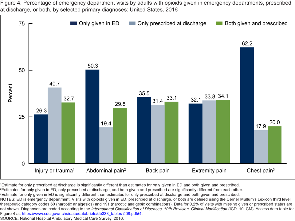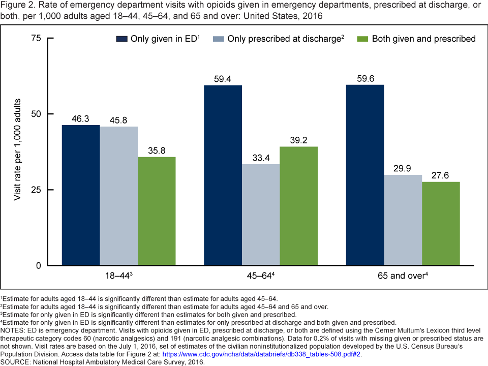Rui P, Schappert SM. Opioids prescribed at discharge or given during emergency department visits among adults in the United States, 2016. NCHS Data Brief, no 338. Hyattsville, MD: National Center for Health Statistics. 2019.