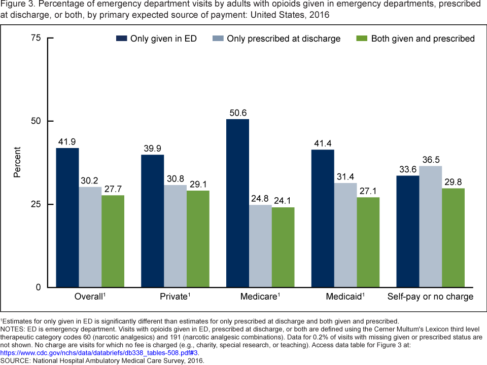 Figure 3. Percentage of emergency department visits by adults with opioids given in emergency departments, prescribed at discharge, or both, by primary expected source of payment: United States, 2016
