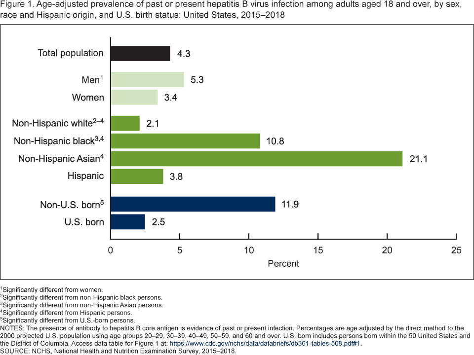 - Past or present HBV infection was highest among non-Hispanic Asian adults (21.1%) compared with non-Hispanic white (2.1%), non-Hispanic black (10.8%), and Hispanic (3.8%) adults, and was greater among adults born outside of the United States than those who were U.S. born.