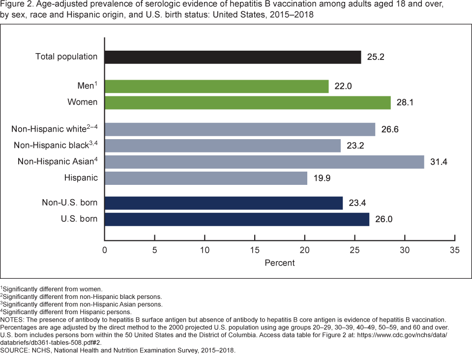 The prevalence of hepatitis B vaccination, based on blood test results, was 25.2%. Prevalence was higher among women (28.1%) compared with men (22.0%), and higher among non-Hispanic Asian adults (31.4%) compared with adults from all other race and Hispanic-origin subgroups. Vaccination status did not differ significantly by U.S. birth status.