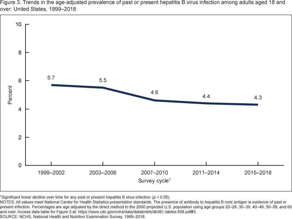 Figure 3. Trends in the age-adjusted prevalence of past or present hepatitis B virus infection among adults aged 18 and over: United States, 1999–2018