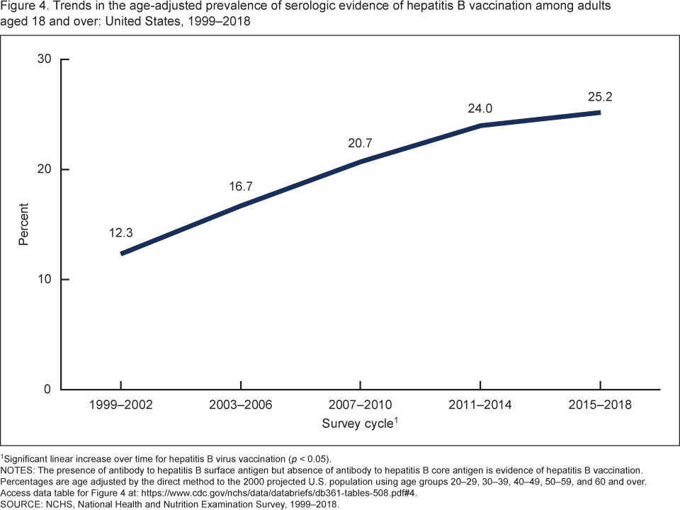 Figure 4. Trends in the age-adjusted prevalence of serologic evidence of hepatitis B vaccination among adults aged 18 and over: United States, 1999–2018