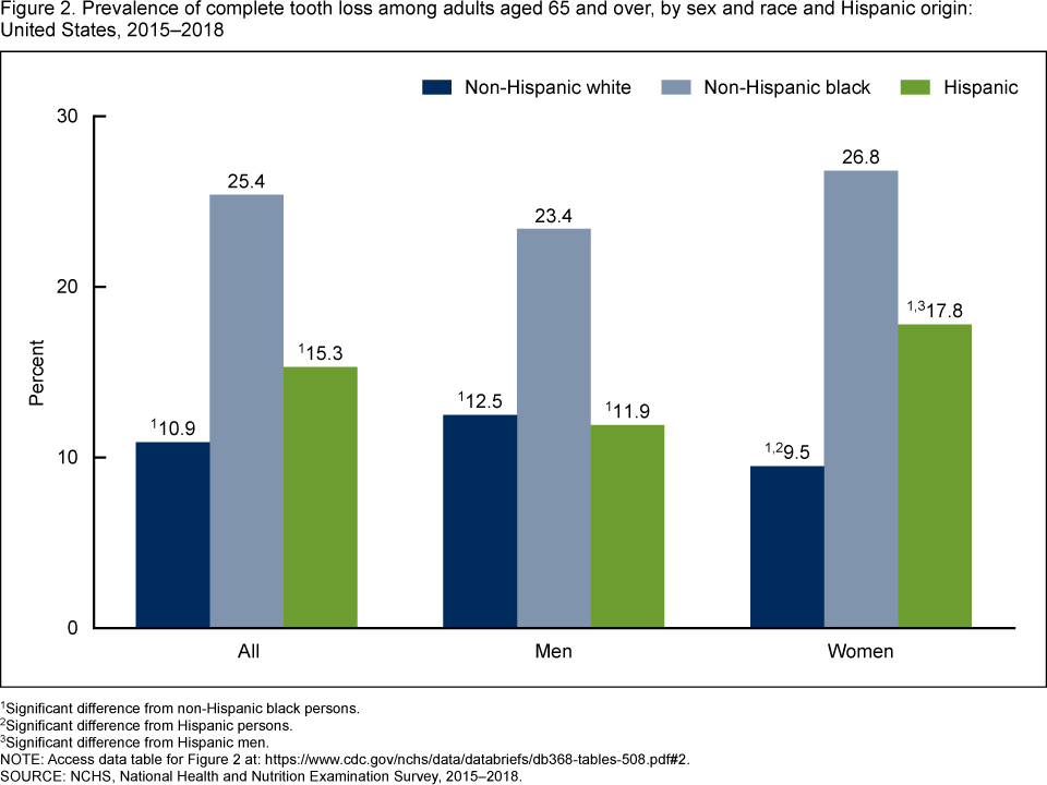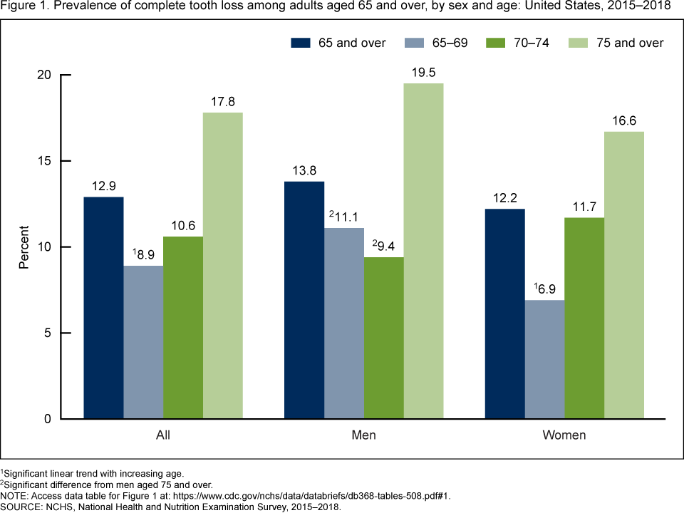 Fleming E, Afful J, Griffin SO. Prevalence of tooth loss among older adults: United States, 2015–2018. NCHS Data Brief, no 368. Hyattsville, MD: National Center for Health Statistics. 2020.