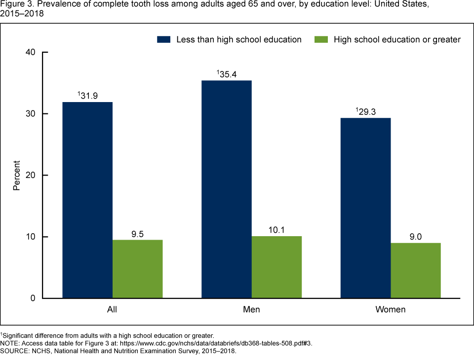 - Prevalence of complete tooth loss was higher for older adults with less than a high school education (31.9%) compared with those with a high school education or greater (9.5%).