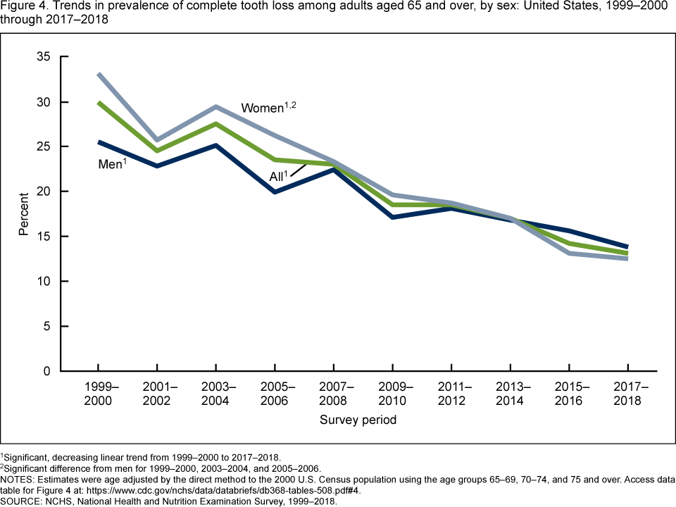 - From 1999–2000 through 2017–2018, the age-adjusted prevalence of complete tooth loss among all older adults declined significantly.