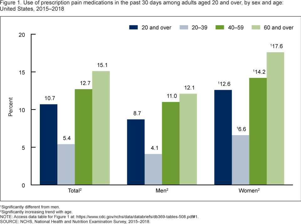 Hales CM, Martin CB, Gu Q. Prevalence of prescription pain medication use among adults: United States, 2015–2018. NCHS Data Brief, no 369. Hyattsville, MD: National Center for Health Statistics. 2020.