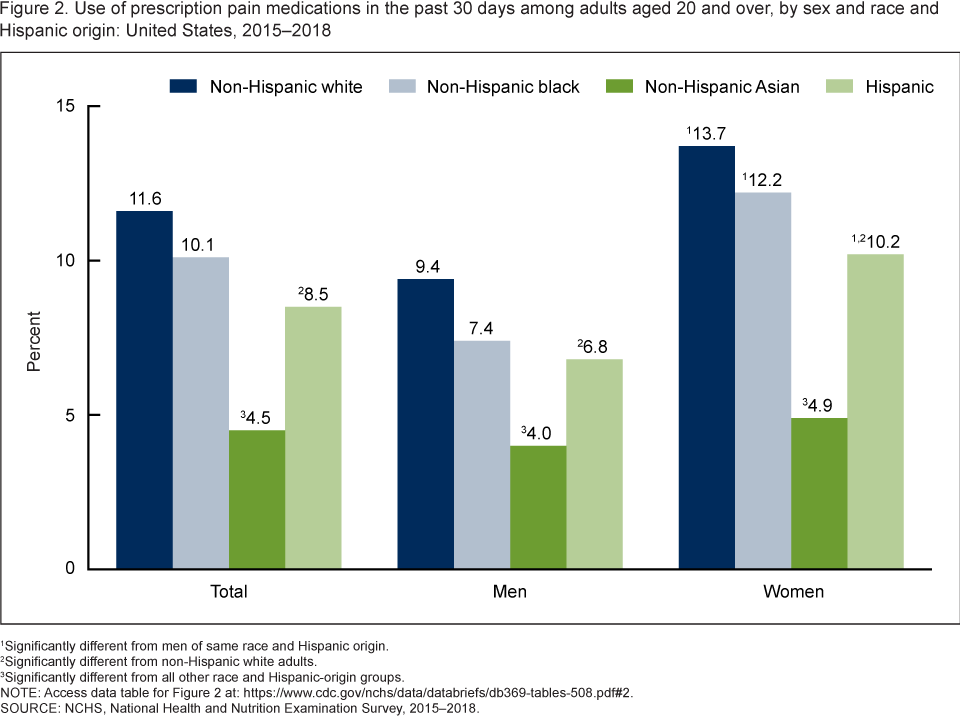 Prescription pain medication use was higher among women than among men for non-Hispanic white (13.7% compared with 9.4%), non-Hispanic black (12.2% compared with 7.4%), and Hispanic (10.2% compared with 6.8%) adults.