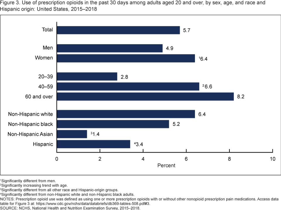 In 2015–2018, 5.7% of U.S. adults used one or more prescription opioids in the past 30 days (Figure 3). Use among women (6.4%) was higher than among men (4.9%), and use increased with age, from 2.8% among adults aged 20–39 to 6.6% for those aged 40–59 to 8.2% for those aged 60 and over. Use among non-Hispanic Asian adults (1.4%) was lowest among all race and Hispanic-origin groups. Use of prescription opioids was lower among Hispanic adults (3.4%) compared with non-Hispanic white adults (6.4%) and non-Hispanic black adults (5.2%).