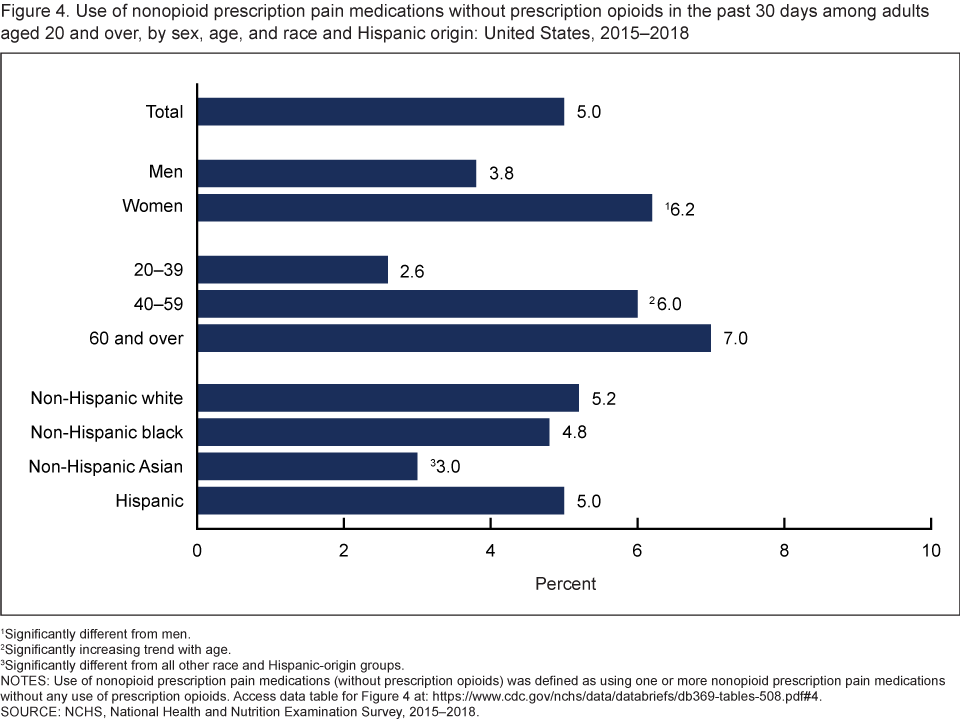 In 2015–2018, 5.0% of U.S. adults used one or more nonopioid prescription pain medications without prescription opioids in the past 30 days (Figure 4). Use was higher among women (6.2%) than among men (3.8%), and use increased with age, from 2.6% among adults aged 20–39 to 6.0% for those aged 40–59 to 7.0% for those aged 60 and over. Use was lowest among non-Hispanic Asian adults (3.0%) compared with all other race and Hispanic-origin groups. Use among non-Hispanic white (5.2%), non-Hispanic black (4.8%), and Hispanic (5.0%) adults did not differ.