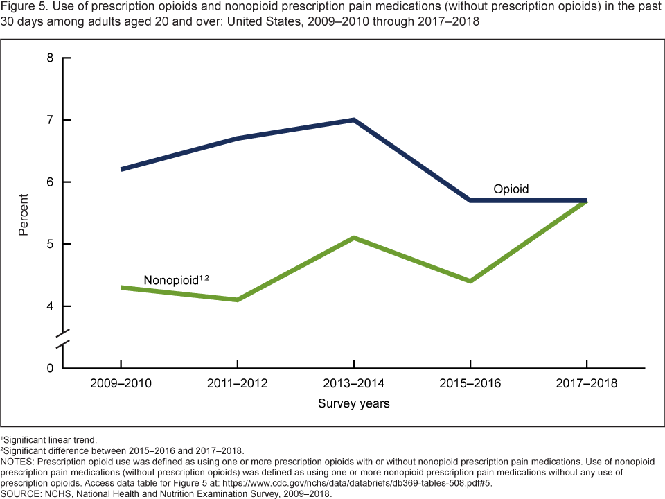 - From 2009–2010 through 2017–2018, no significant change in the use of prescription opioids was seen, but use of nonopioid prescription pain medications (without prescription opioids) increased.