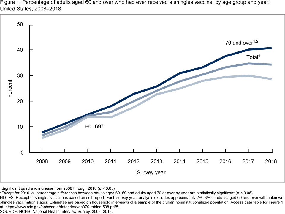 Terlizzi EP, Black LI. Shingles vaccination among adults aged 60 and over: United States, 2018. NCHS Data Brief, no 370. Hyattsville, MD: National Center for Health Statistics. 2020.