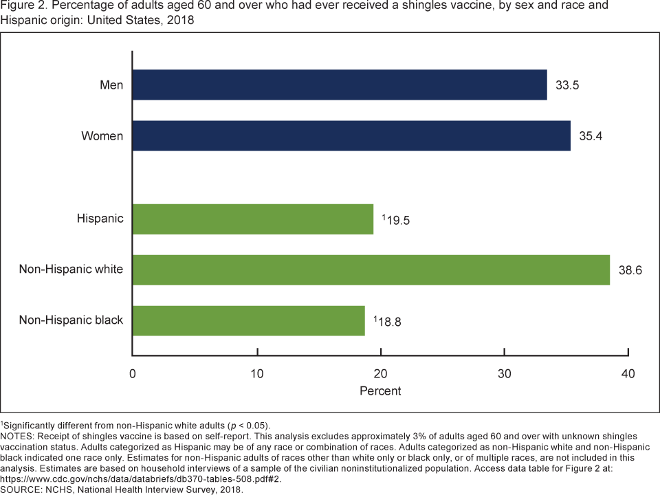 - Non-Hispanic white adults (38.6%) were approximately twice as likely as non-Hispanic black (18.8%) and Hispanic (19.5%) adults to have ever received a shingles vaccine.
