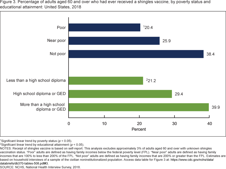 - Receipt of shingles vaccination varied by poverty status and educational attainment among adults aged 60 and over.