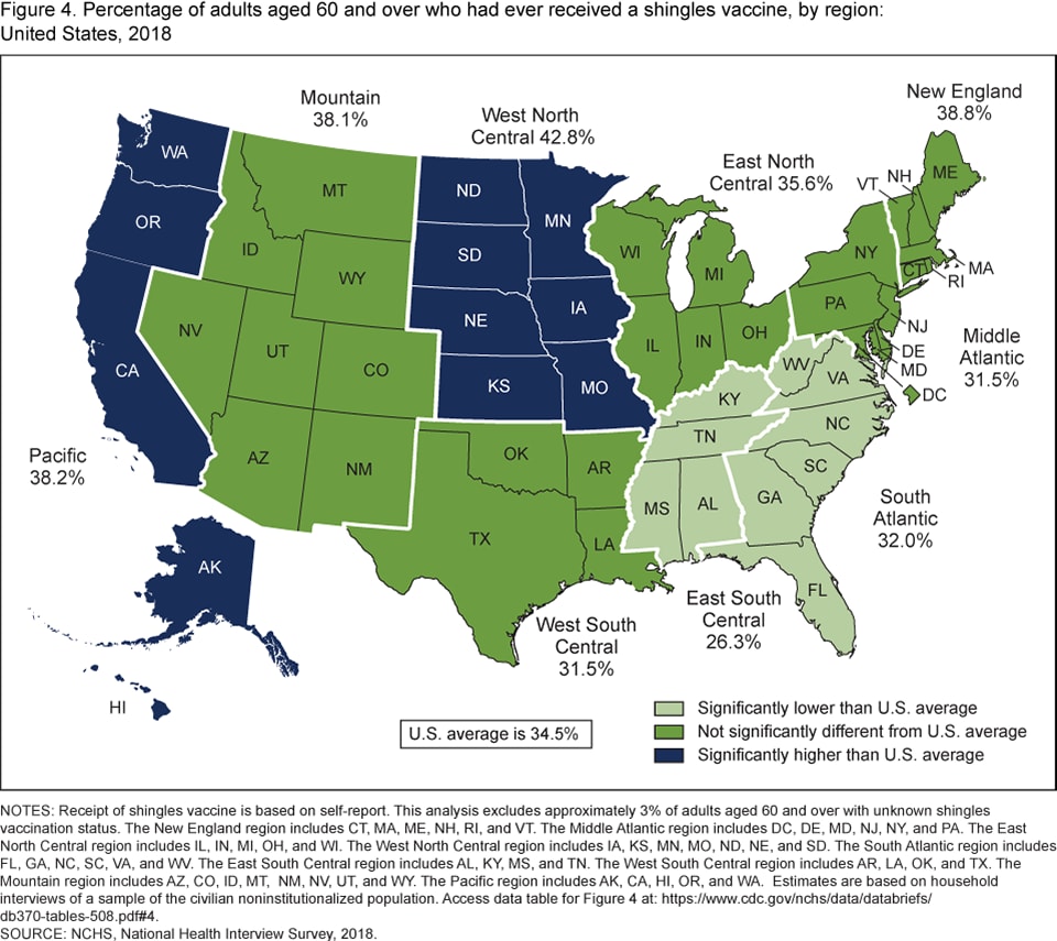 - The percentage of adults aged 60 and over who had ever received a shingles vaccine in the Mountain (38.1%), West South Central (31.5%), East North Central (35.6%), Middle Atlantic (31.5%), and New England (38.8%) regions was not significantly different from the national average.