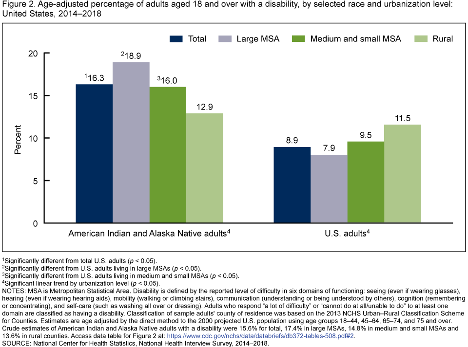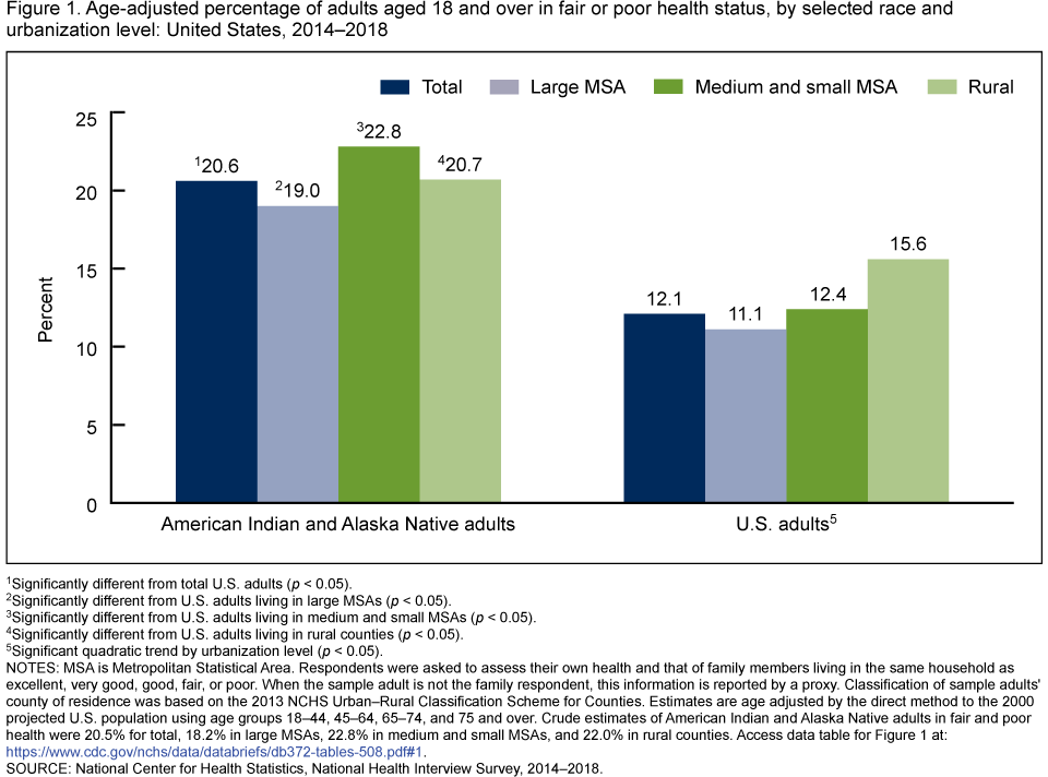 Villarroel MA, Clarke TC, Norris T. Health of American Indian and Alaska Native adults, by urbanization level: United States, 2014–2018. NCHS Data Brief, no 372. Hyattsville, MD: National Center for Health Statistics. 2020.