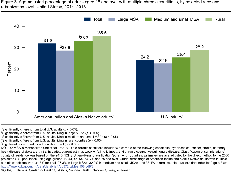 - The age-adjusted percentage of adults with multiple chronic conditions differed by urbanization level for AIAN and all U.S. adults.