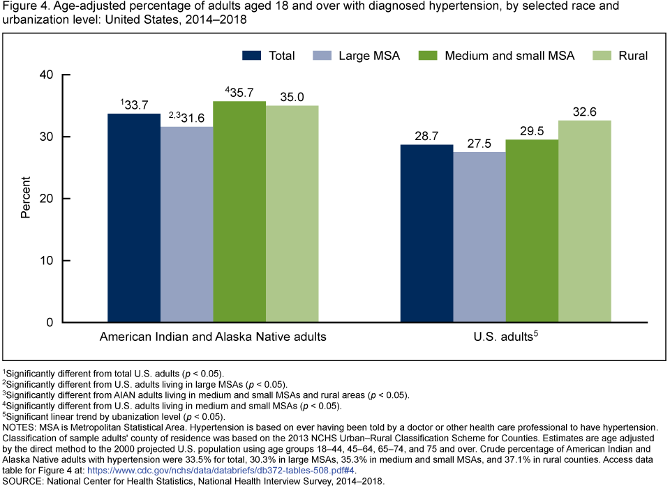 - The percentage of AIAN adults with diagnosed hypertension was highest in medium and small MSAs (35.7%) and rural areas (35.0%).