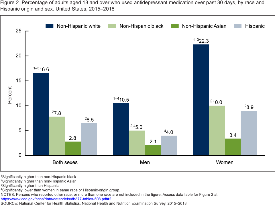 - Antidepressant use was higher among non-Hispanic white (16.6%) adults compared with non-Hispanic black (7.8%), Hispanic (6.5%), and non-Hispanic Asian (2.8%) adults.