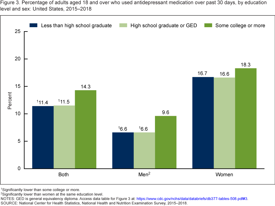 - Antidepressant medication use was higher for adults with at least some college education (14.3%) compared with those with a high school education (11.5%) or less (11.4%).