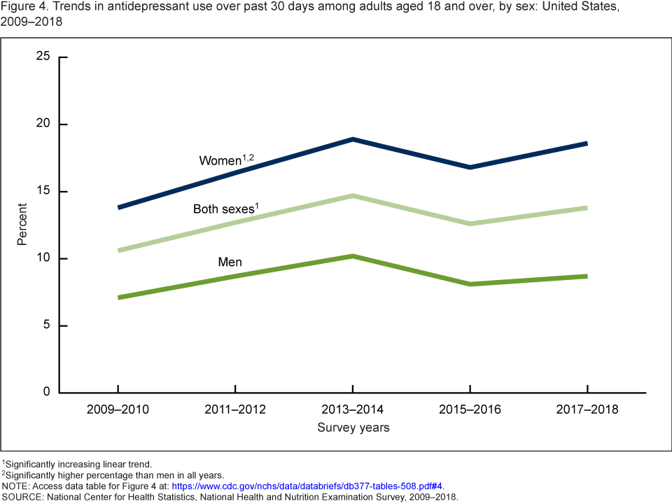 - From 2009–2010 through 2017–2018, the percentage of adults who used antidepressants increased among women, but not men.