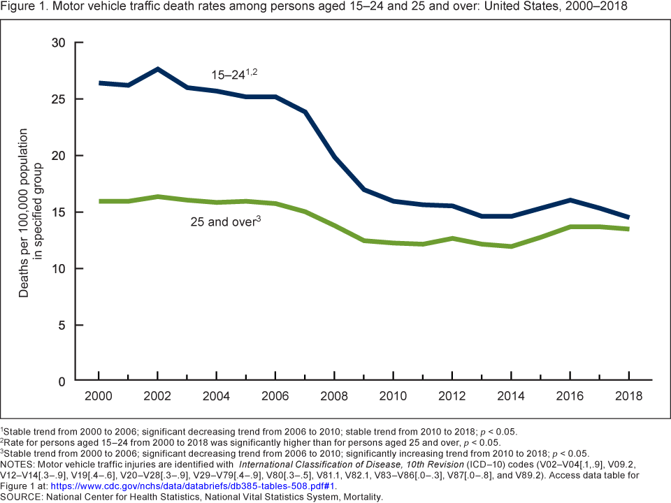 - The death rate due to motor vehicle traffic (MVT) injury for persons aged 15–24 was stable from 2000 to 2006, declined 36% from 2006 (25.1 per 100,000) to 2010 (16.1), and then was stable through 2018 (14.7).