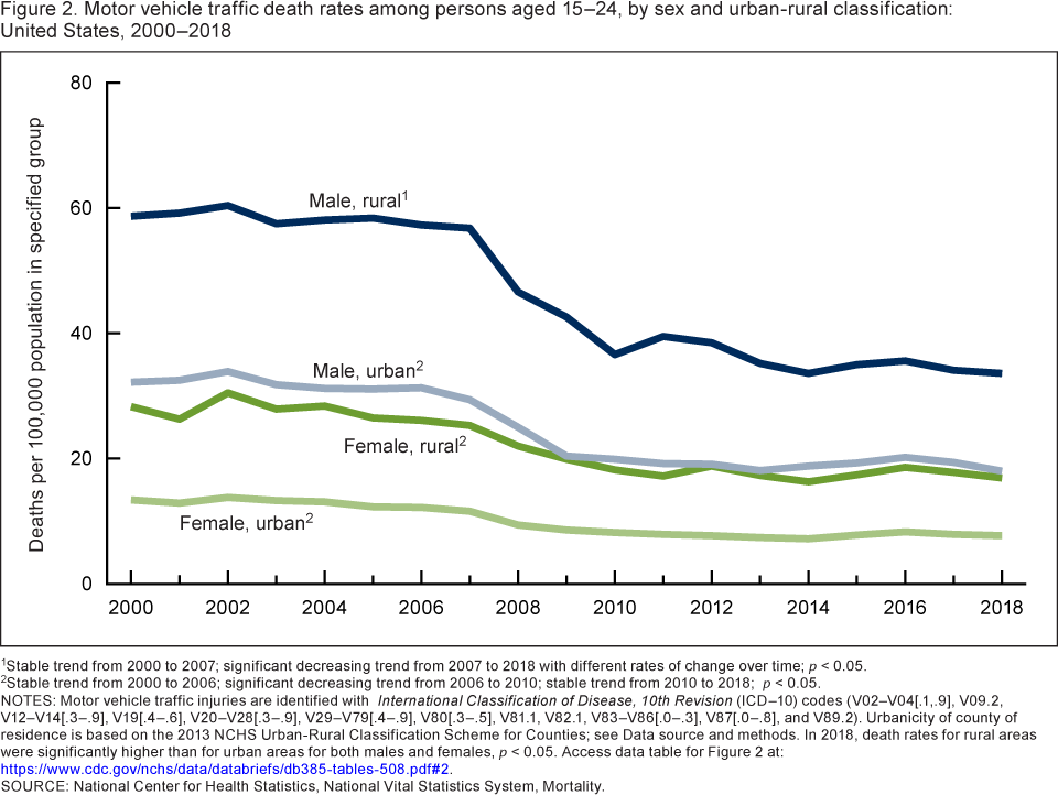 Curtin SC, Tejada-Vera B. Motor vehicle traffic death rates among adolescents and young adults aged 15–24, by urbanicity: United States, 2000–2018. NCHS Data Brief, no 385. Hyattsville, MD: National Center for Health Statistics. 2020.