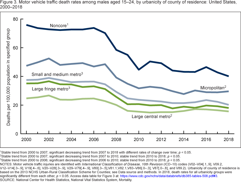 - Although males aged 15–24 residing in the most rural counties (noncore) had the highest MVT death rate of all urbanicity groups, the rate significantly declined from 2006 to 2018.