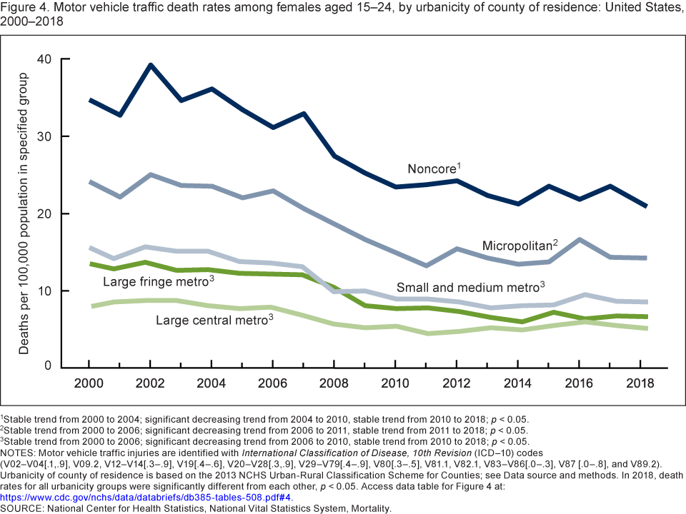 Figure 4. Motor vehicle traffic death rates among females aged 15–24, by urbanicity of county of residence: United States, 2000–2018