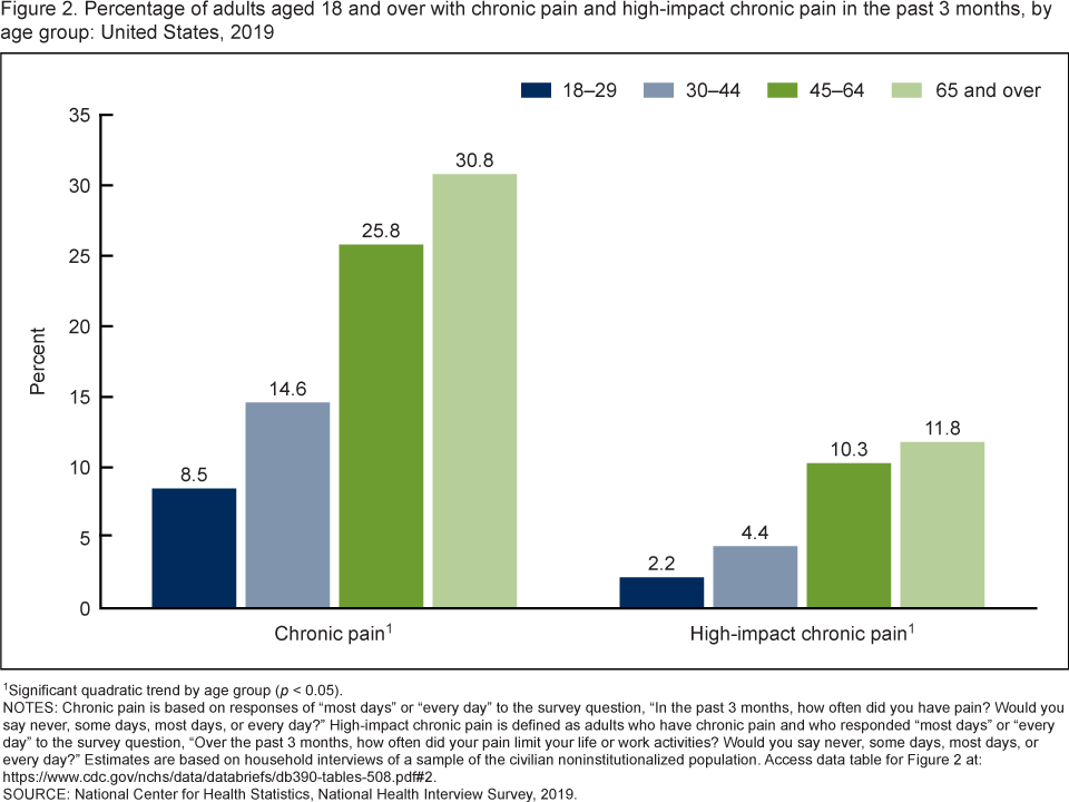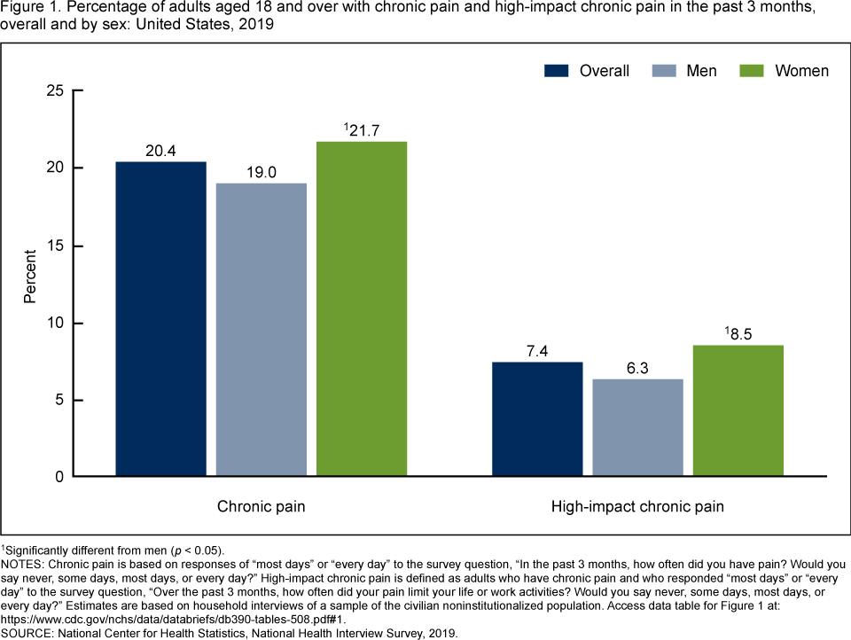 Zelaya CE, Dahlhamer JM, Lucas JW, Connor EM. Chronic pain and high-impact chronic pain among U.S. adults, 2019. NCHS Data Brief, no 390. Hyattsville, MD: National Center for Health Statistics. 2020.