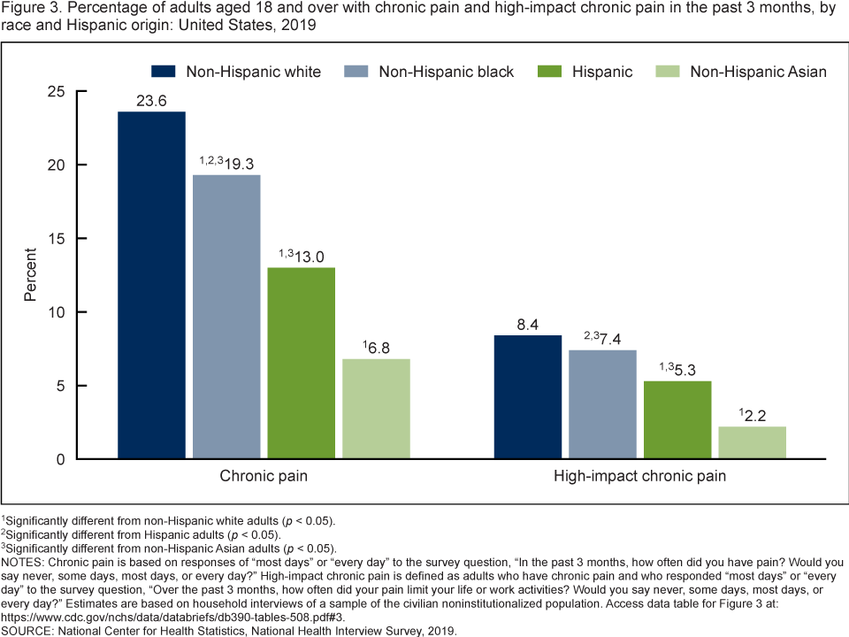 - Non-Hispanic white adults (23.6%) were more likely to have chronic pain in the past 3 months compared with non-Hispanic black (19.3%), Hispanic (13.0%), and non-Hispanic Asian (6.8%) adults. Chronic pain was least likely among non-Hispanic Asian adults (Figure 3).