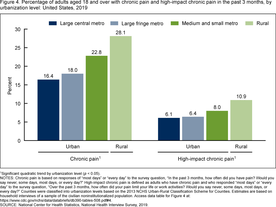 - The percentage of adults who had high-impact chronic pain in the past 3 months also increased as place of residence became more rural, from 6.1% in large central metropolitan areas to 10.9% in rural areas.