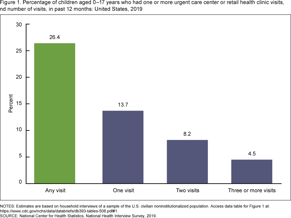 - In 2019, more than one in four children had one or more visits to an urgent care center or retail health clinic (26.4%) in the past 12 months.