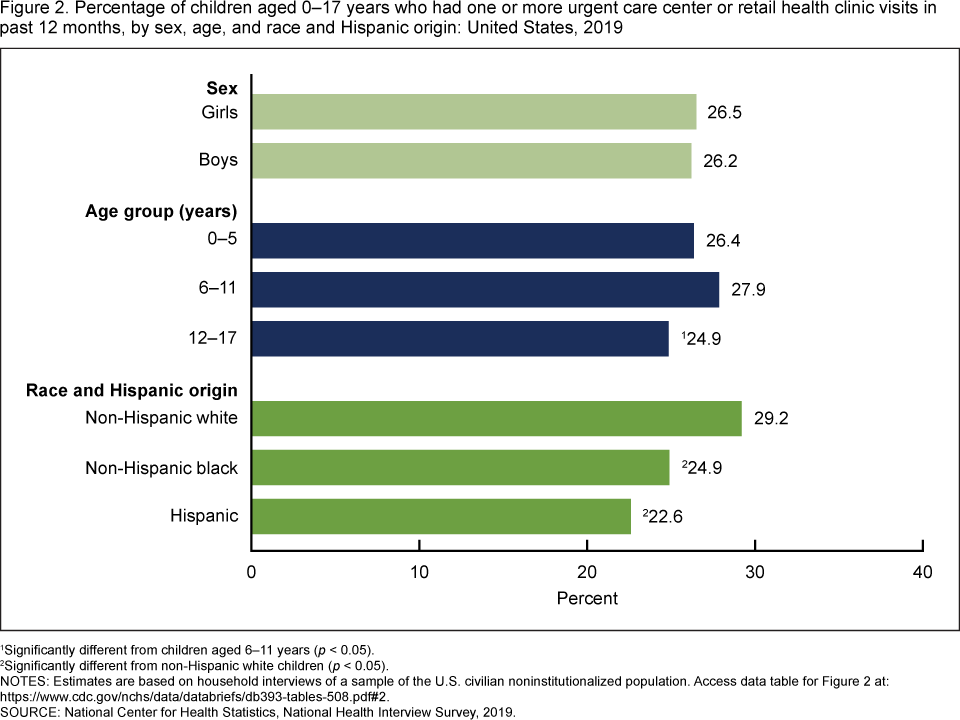 Black LI, Zablotsky B. Urgent care center and retail health clinic utilization among children: United States, 2019. NCHS Data Brief, no 393. Hyattsville, MD: National Center for Health Statistics. 2020.