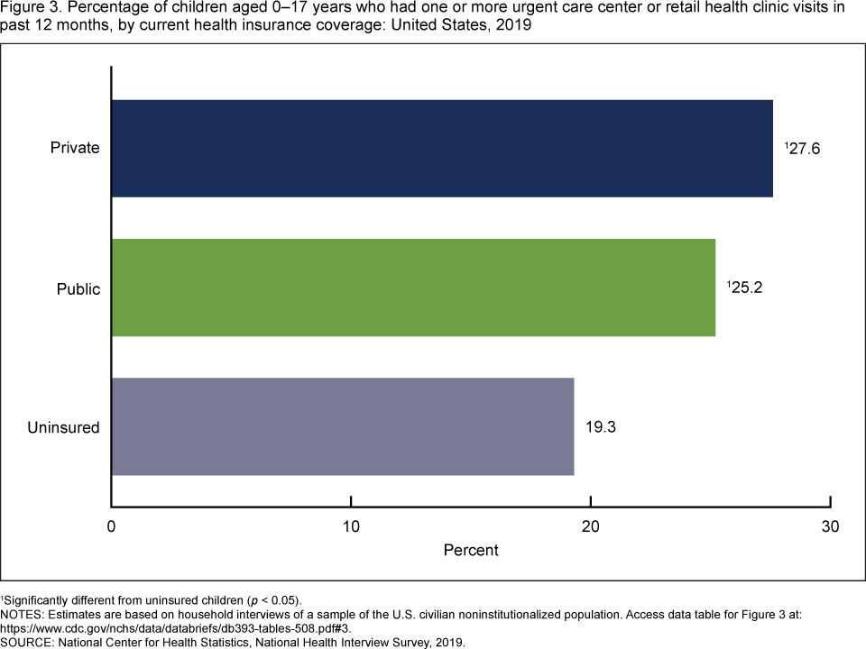 - Children with private (27.6%) or public (25.2%) health insurance were more likely than uninsured children (19.3%) to have had one or more urgent care center or retail health clinic visits.