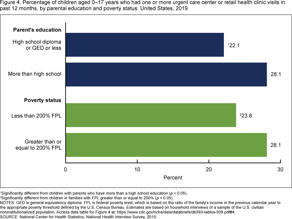 Figure 4. Percentage of children aged 0–17 years who had one or more urgent care center or retail health clinic visits in past 12 months, by parental education and poverty status: United States, 2019