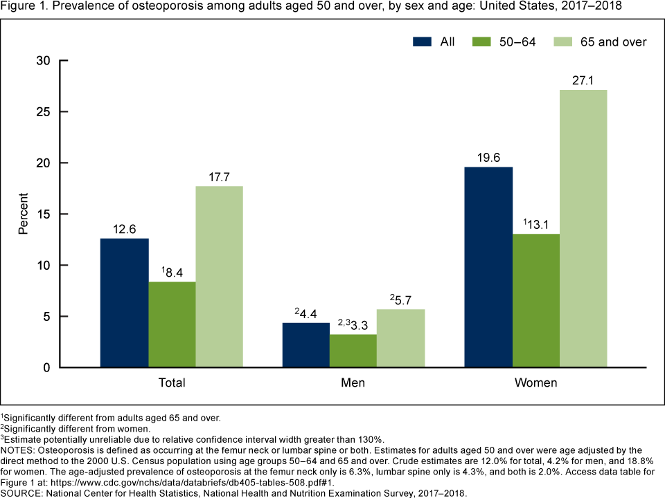 - In 2017–2018, the age-adjusted prevalence of osteoporosis at either the femur neck or lumbar spine or both among adults aged 50 and over was 12.6% and was higher among women (19.6%) compared with men (4.4%).