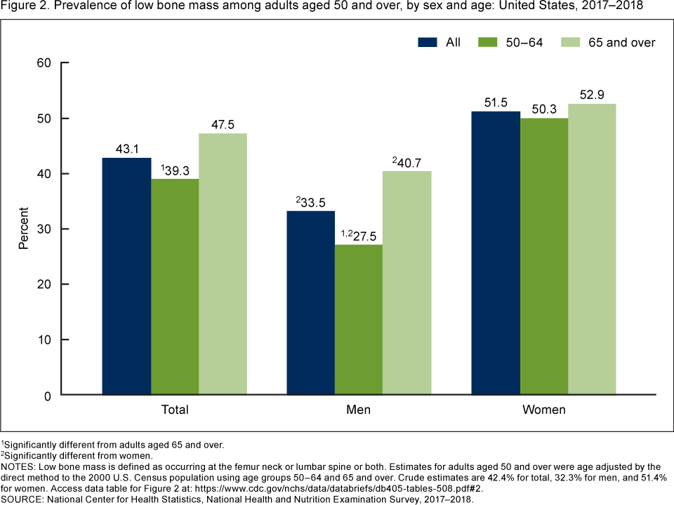 Sarafrazi N, Wambogo EA, Shepherd JA. Osteoporosis or low bone mass in older adults: United States, 2017–2018. NCHS Data Brief, no 405. Hyattsville, MD: National Center for Health Statistics. 2021. DOI: https://dx.doi.org/10.15620/cdc:103477external icon.