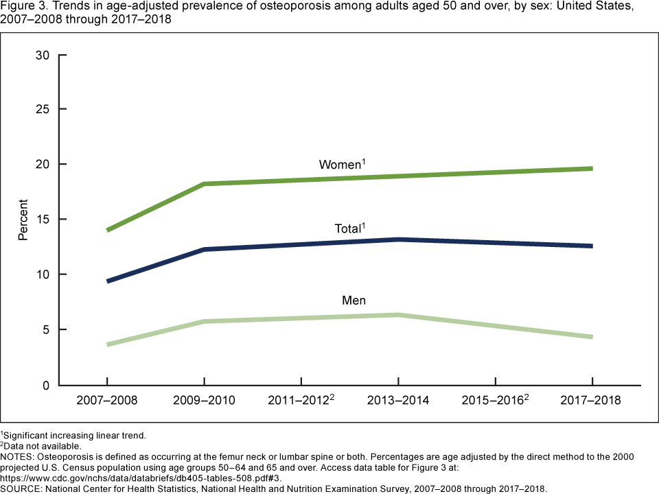 From 2007–2008 through 2017–2018, the age-adjusted prevalence of osteoporosis in women increased from 14.0% to 19.6%, but no significant change was seen among men. No significant change was seen in low bone mass prevalence for men or women from 2007–2008 through 2017–2018.