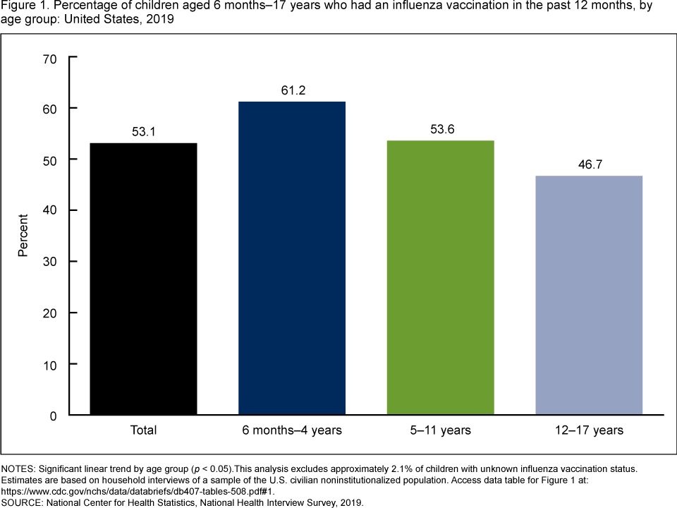 Black LI, Ng AE, Zablotsky B. Influenza vaccination in the past 12 months among children aged 6 months–17 years: United States, 2019. NCHS Data Brief, no 407. Hyattsville, MD: National Center for Health Statistics. 2021. DOI: https://doi.org/10.15620/cdc:104187..