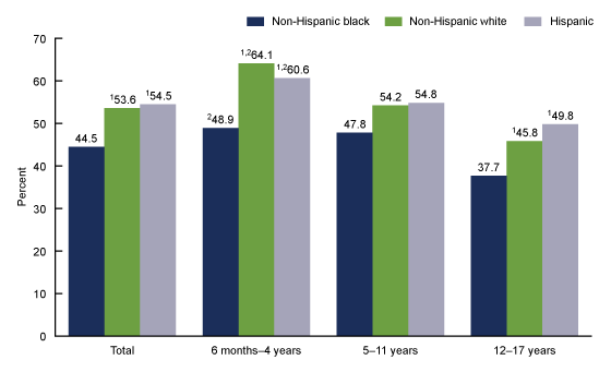 Race and Hispanic origin: Children categorized as Hispanic may be of any race or combination of races. Children categorized as non-Hispanic white or non-Hispanic black indicated one race only. Estimates for non-Hispanic children of races other than white only or black only, or of multiple races, are not shown.