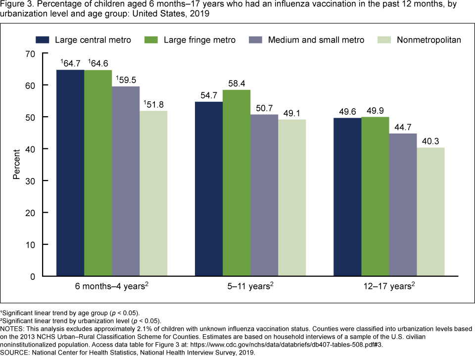 - Across all age groups, children in more rural areas had lower influenza vaccination coverage than those in urban areas.