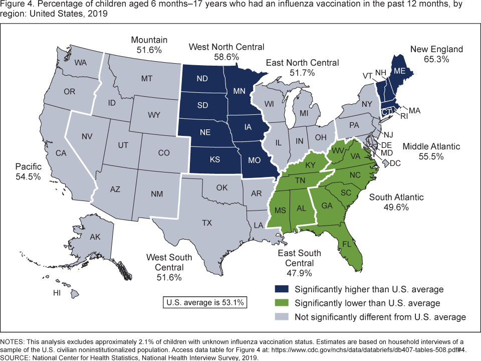 - The percentage of children who had received an influenza vaccination in the past 12 months ranged from 47.9% in the East South Central region to 65.3% in the New England region of the United States.