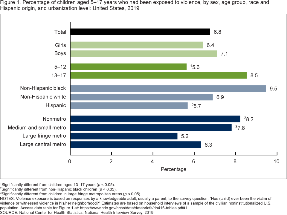 - In 2019, 6.8% of children aged 5–17 years were victims of or witnessed violence in their neighborhood with exposure varying by age, race and Hispanic origin, and level of urbanization.