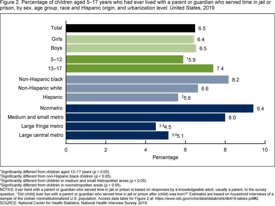 - A higher percentage of non-Hispanic black children (8.2%) had lived with a parent or guardian who served time in jail or prison compared with Hispanic (5.6%) and non-Hispanic white children (6.6%), although the observed difference between non-Hispanic black and non-Hispanic white children was not significant.