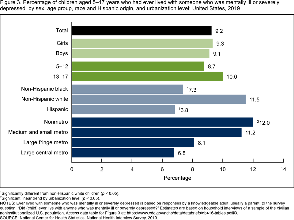 - The percentage of children who had lived with someone who was mentally ill or severely depressed varied by race and Hispanic origin and urbanization level.