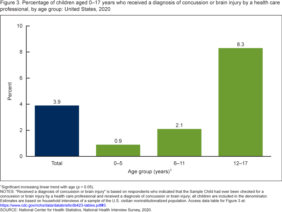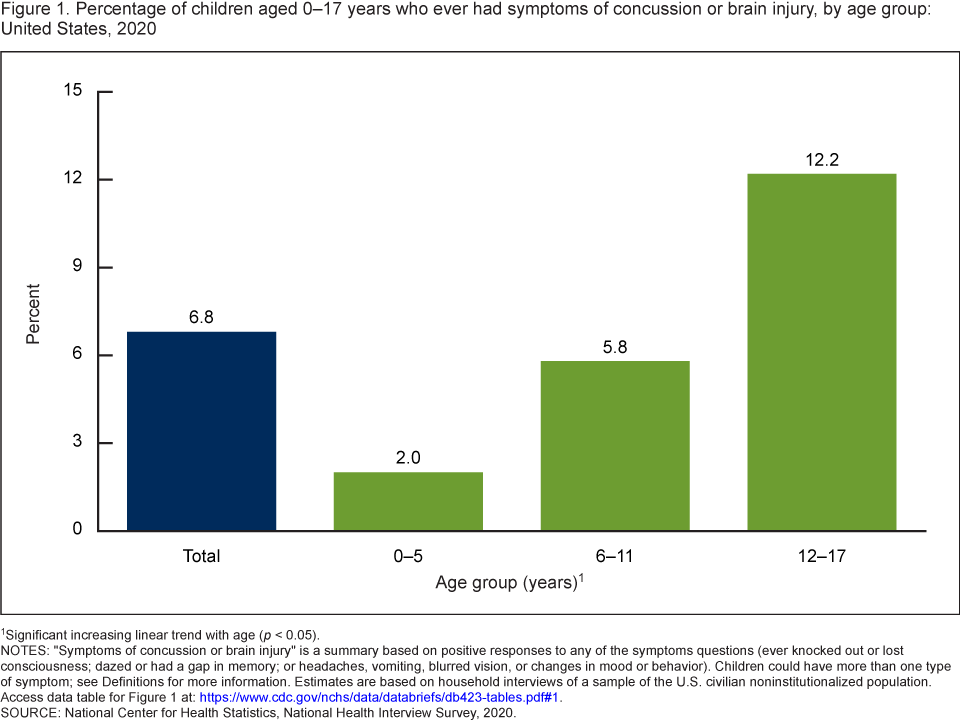 Black LI, Zablotsky B. Concussions and brain injuries in children: United States, 2020. NCHS Data Brief, no 423. Hyattsville, MD: National Center for Health Statistics. 2021. DOI: https://dx.doi.org/10.15620/cdc:111174.