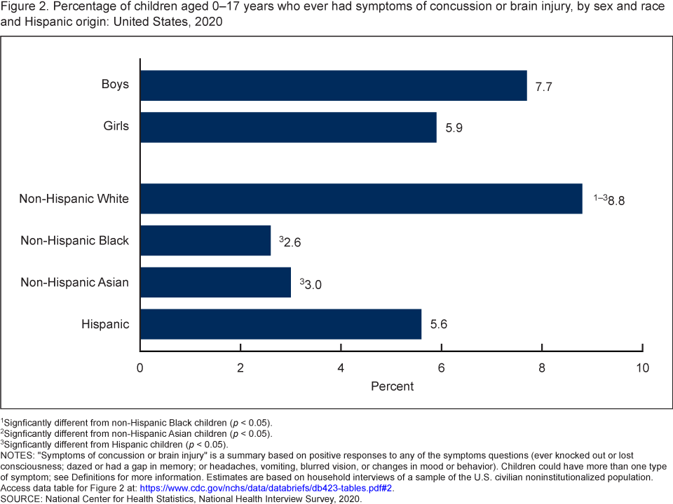- Non-Hispanic White children were more likely than children of other race and Hispanic-origin groups to have ever had symptoms of a concussion or brain injury.