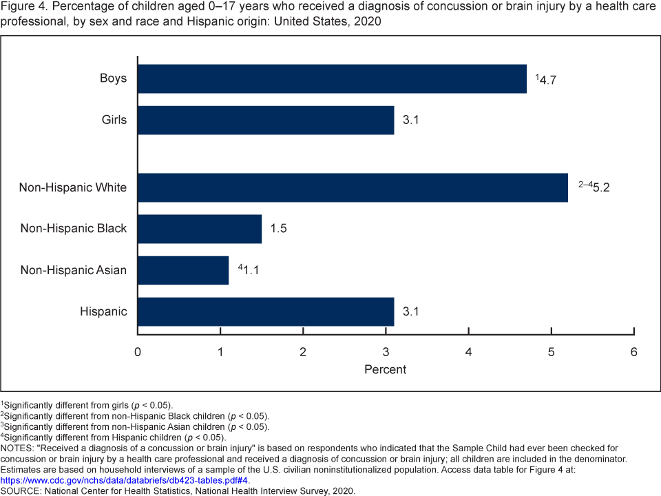 - Compared with their peers, boys (4.7%) and non-Hispanic White children (5.2%) were more likely to have ever had a diagnosis of a concussion or brain injury.